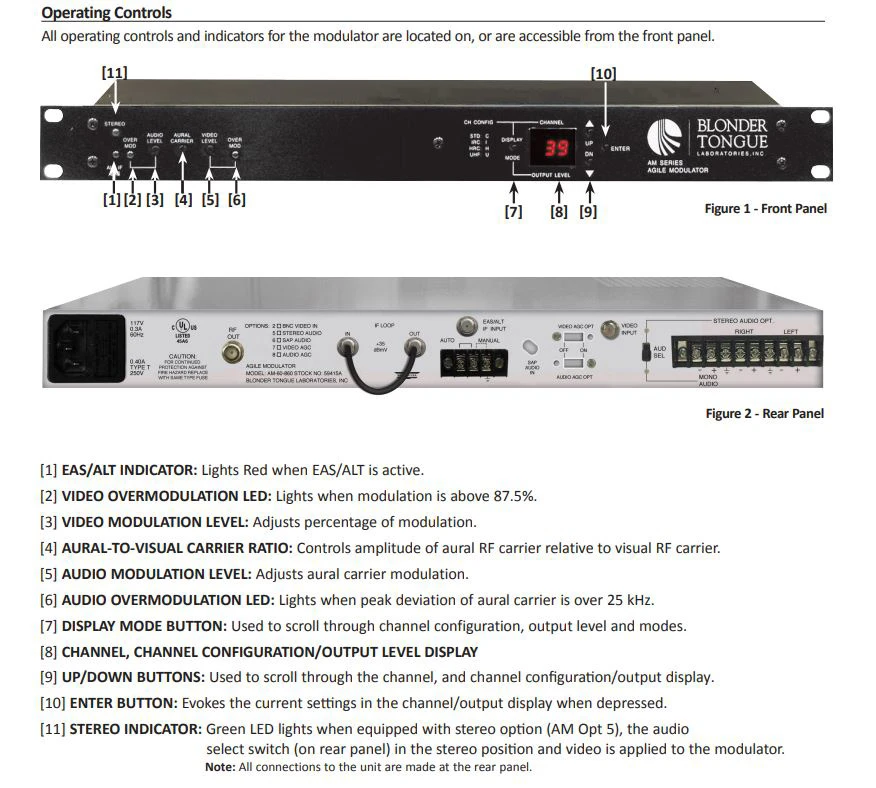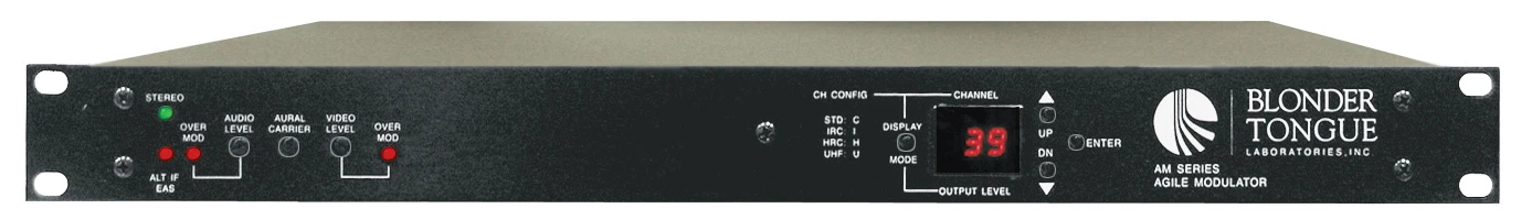 The Blonder Tongue AM-60-860 is a professional quality agile audio/video modulator. It is equipped with the Emergency Alert System (EAS) feature, which can also be used as an alternate IF input. The unit provides an audio and video modulated RF carrier on any channel from 54 to 860 MHz. Any standard audio/video source can be used, such as satellite receivers, television cameras, video tape recorders, or television demodulators.