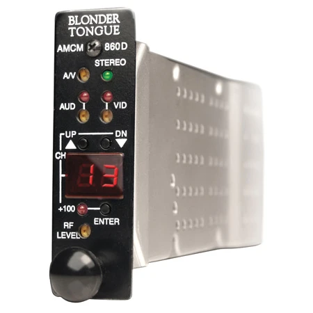 The Blonder Tongue AMCM-860 is a frequency-agile analog audio/video modulator available in NTSC channels 2-135 (54-860 MHz). Models are available in both stereo and mono audio inputs. This 4th generation of AMCM-860 is equipped with the CALMTones feature, utilizing Audio AG