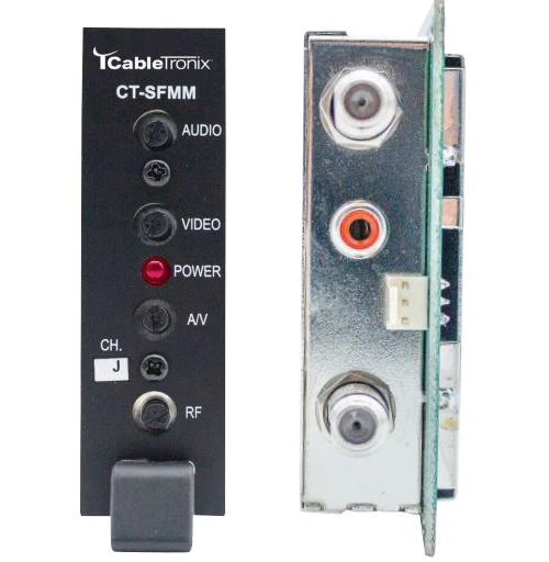 The CableTronix CT-SFMM is a professional quality, channelized, heterodyne audio/video SAW filtered micro RF modulator. The unit provides a mono audio and video modulated RF carrier output on any single CATV channel from 2-13 & 14-59 (A-WW). The CT-SFMM is ideal for placing audio and video onto any unused CATV channel. Different standard audio/video sources, such as satellite receivers, television cameras, videotape recorders, or television demodulators can be used.