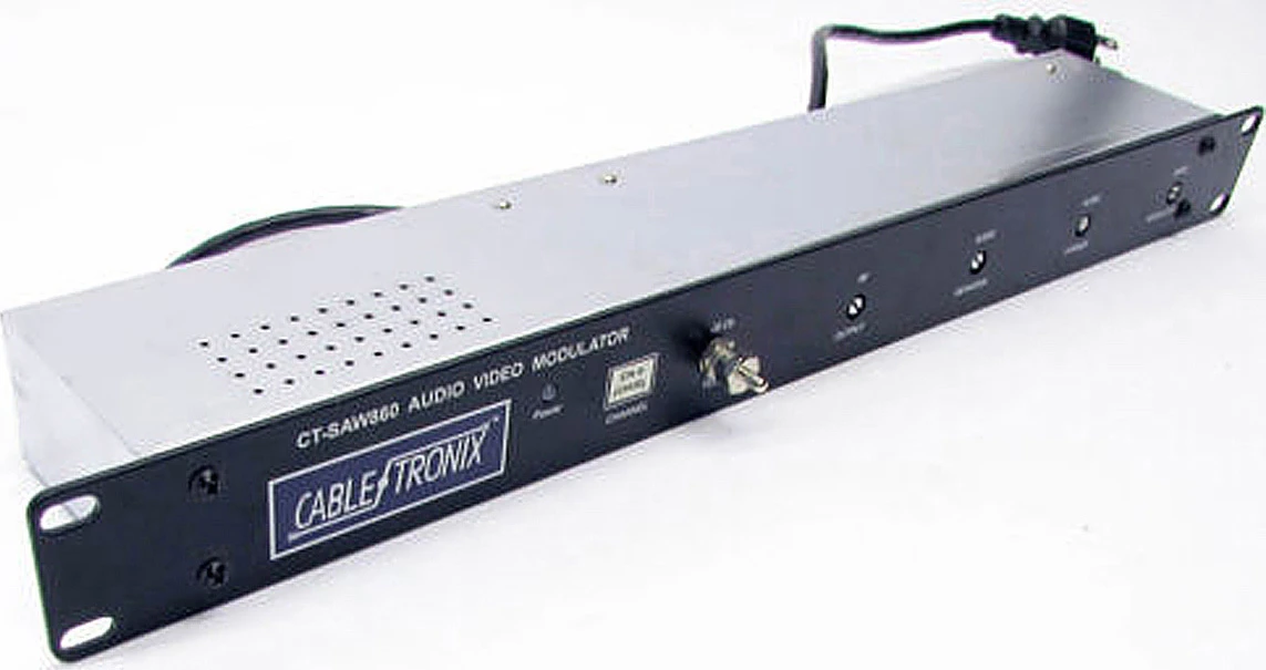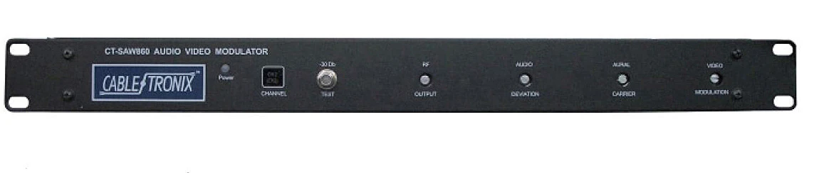 The CT-SAW860 is a professional quality fixed channel 19″ rack mounted modulator providing an audio and video modulated RF carrier for any single channel between 2 and 127 CATV. Any standard audio/video source can be used, including satellite receivers, demodulators, VCRs, laser/DVD players, and TV/security cameras.