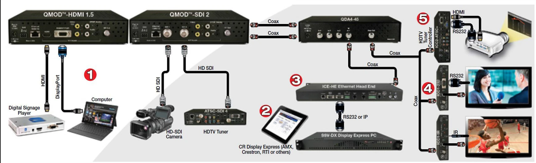 QMOD HD Modulator/IPTV Encoders process media from SDI, HDMI, Component and RGBHV sources in to HD in-house channels.