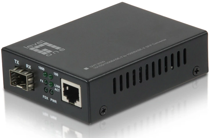 The LevelOne GVT-2000 media converter is able to convert network signals between copper and fiber-optic based networks. The converter provides a SFP slot for 1000Base-X Gigabit optic module and a 10/100/1000Base-T RJ-45 port, supports full duplex and half duplex switch connectivity and 10Base-T, 100Base-TX and 1000Base-T auto-sensing.