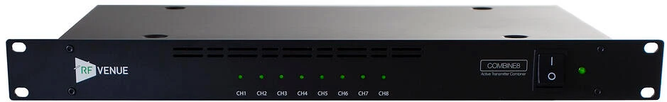 The RF Venue COMBINE8 IEM combiner brings together up to eight in-ear monitor transmitter signals into a single rear panel mounted antenna connector.