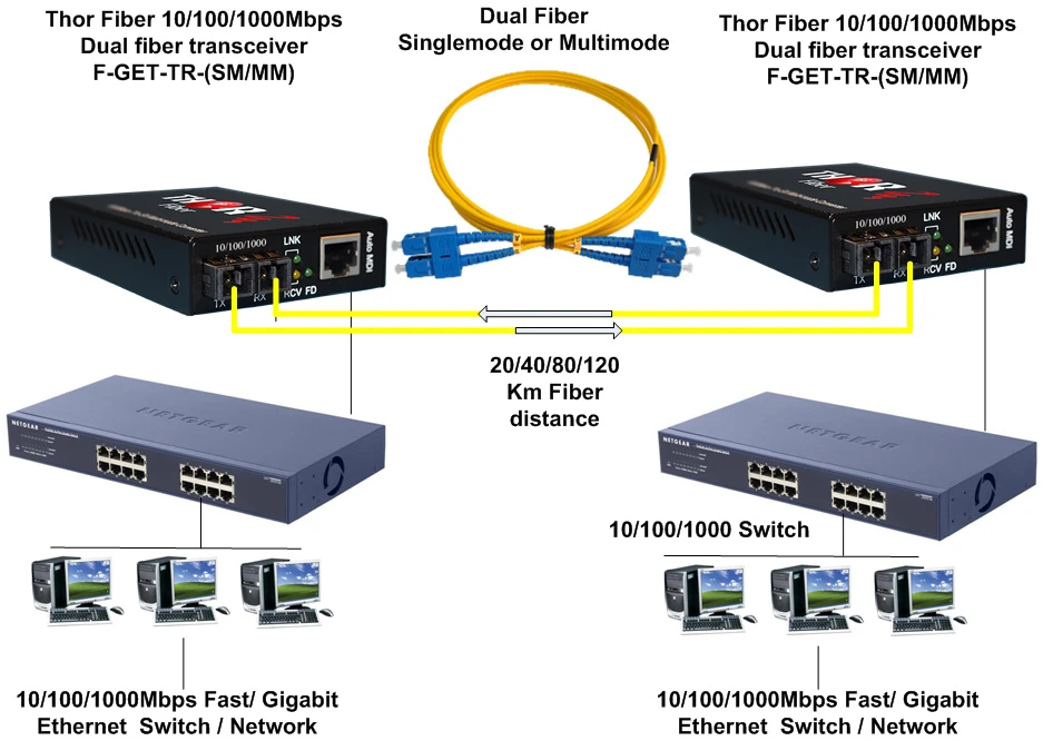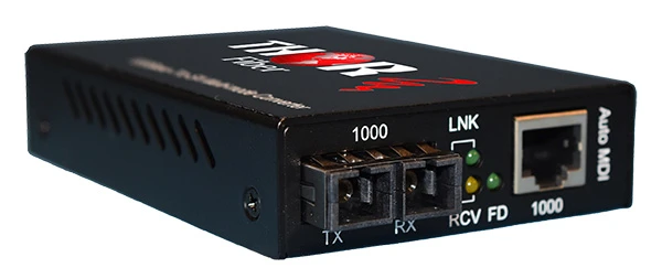The Thor Fiber F-GET-TR-MM media converters were specifically designed to offer network designers the tools for migration from copper based Gigabit to fiber based Gigabit Ethernet. Now, migration or expansion of existing networks can be possible with minimum cost and complexity. These Thor Gigabit converters are completely transparent when installed so your network performs exactly the way it was previously, but now it can migrate both copper and fiber mediums. This flexibility in cabling allows network managers to put fiber cables anywhere within a network without changing the arrangement of copper based Gigabit segments. Their compact size allows the converters to be easily installed in any narrow desktop location or used in a wall-mount format to save space. Several converters can be simultaneously installed by using the F-CHAS 12-slot 19″ rack-mount chassis. The F-GET-TR-MM takes advantage of Gigabit Ethernet technology, suitable for transmission applications of larger bandwidth like Video, Image, and Voice over IP.