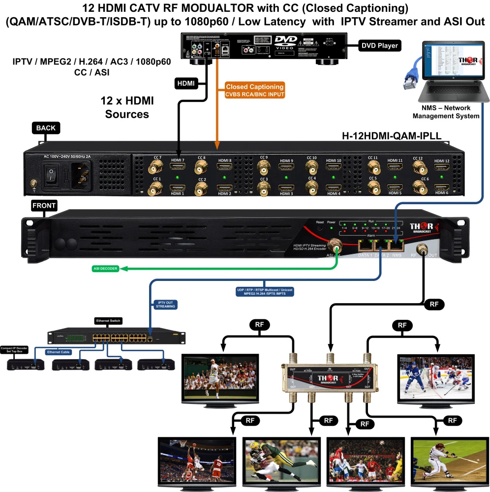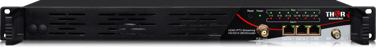 The high capacity H-12HDMI-QAM-IPLL Encoder Modulator from Thor Broadcast has a sophisticated redesigned platform for enabling modulation of up to 12 HDMI sources and 12 CVBS CC(Closed Caption) sources simultaneously. This unit has the ability to ingest IP Transport Streams and multiplex them among the RF output channels, similarly you can also input a single ATSC(or other RF modulation standard) and add its transport streams among the QAM output. This unit comes standard with a plethora of options to help you add extra transport streams from various media to build your own RF headend quickly and easily without extra hardware. The H-12HDMI-QAM-IPLL supports MPEG2 and MPEG-4 AVC/H.264 video encoding and MPEG1 Layer II audio encoding (MPEG-2 AAC, MPEG-4 AAC Optional), Dolby Digital AC3, as well as AC3 pass through. This unit has the ability to multiplex, create, and add program streams to your RF QAM cable channels cost-effective design make this device widely used in variety of digital distribution systems such as CATV headend cable systems, creating your own digital signage systems, and adding HDMI sources to your existing QAM cable system in a single 1RU high density encoder modulator from Thor.