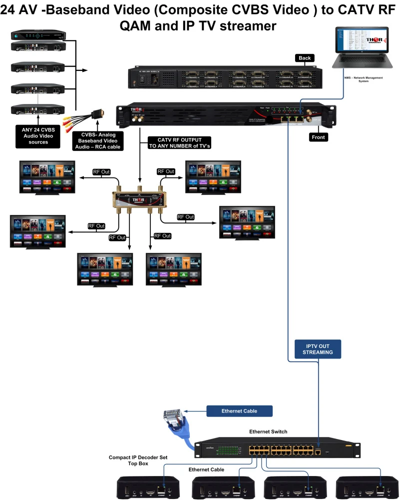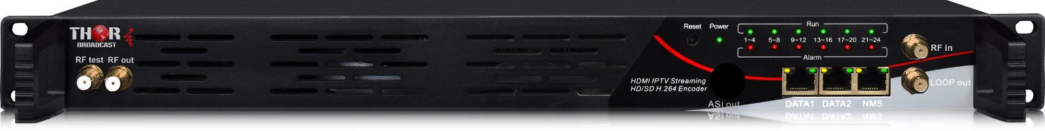 - 8/12/16/20/24 A/V CVBS inputs with MPEG2 Encoding – Modulated 4 RF output – and 4 MPTS’s IP TS ouput