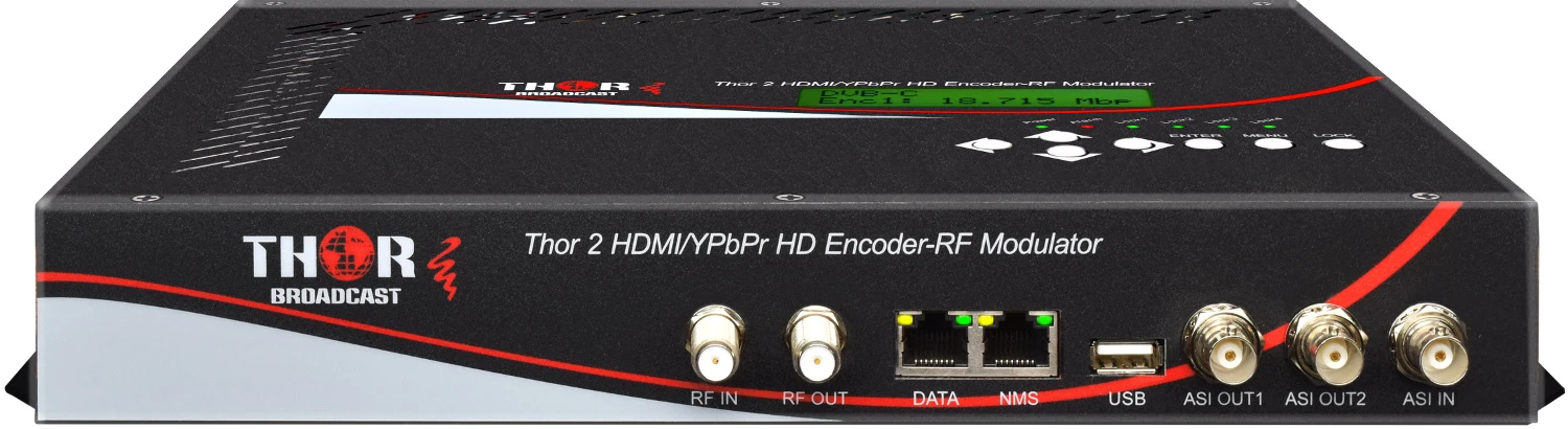 All settings are configurable through either the front panel LCD or through a web browser on a dedicated network port. The NMS (network management software) built into every Thor unit is a proprietary firmware that will allow you to adjust any settings on the encoder from any web browser, from any device located on the same network. A second network port is provided for IPTV streaming output that can directly feed any standard IPTV system. This unit also provides a DVB-ASI input and output for added flexibility and integration with other broadcasting components. This modulator will output RF QAM/ATSC, ASI, and IP simultaneously creating easy distribution over coax and IP. Automated internal chipset will automatically adjust most settings. RF Power levels can be adjusted from 5-35dBmV. All Thor products come with a 5 year warranty and free tech support. Ask your rep how Thor can preconfigure your unit for you, creating a seamless plug and play apparatus to power your own CATV channels.