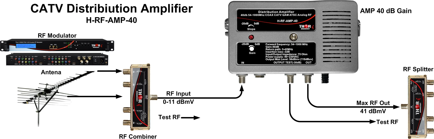 This Thor H-RF-AMP-40 amplifier makes an excellent distribution system amplifier for heavily loaded MDU and broadband CATV and SMATV systems. Because of its extremely low-noise figure and low distortion, the H-RF-AMP-40-RM is ideally suited for use in larger networks where amplifier cascading is required.