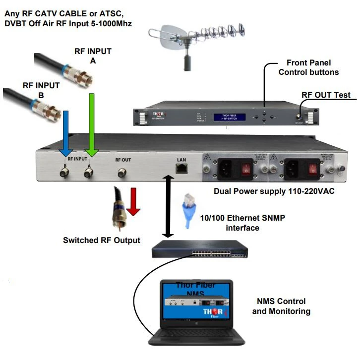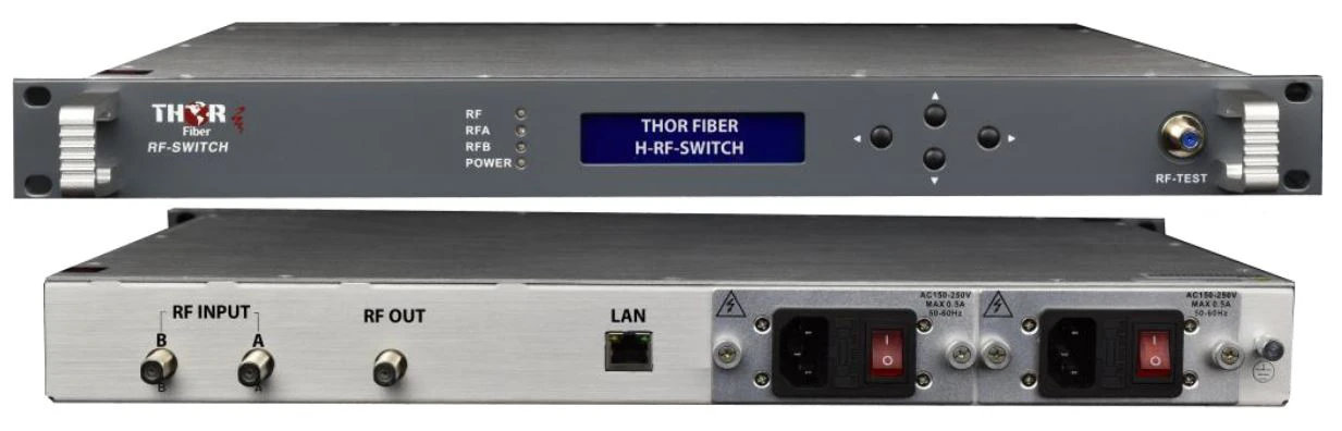 Thor H-RF-SWITCH RF switch is used for signal distribution redundancy or for remote RF switching. Thor’s RF Switch has two inputs and a single output. One of the inputs acts as the primary channel while the second is used for fallover protection. When the switch detects that the incoming RF to the primary channel has dropped below a set reference level the unit will immediately switch to the backup channel. The unit can also be switched manually by either its front control panel or remotely via Ethernet SNMP. Thor’s unit features full remote management for setting system parameters an system monitoring.
