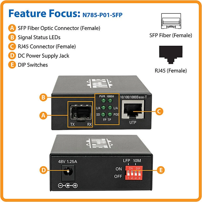 Works in Tandem with Tripp Lite’s N785-Series (Non-PoE) Media Converters. The N785-P01-SFP lets you choose a transceiver that suits your system, while also delivering power to your PoE+ device (Tripp Lite’s N286-01GSX-MDLC and N286-01GLX-SLX transceivers sold separately). It connects to a Tripp Lite N785-Series non-PoE media converter using your choice of singlemode or multimode cabling. It also delivers data and power to a 10/100/1000 Mbps PoE device up to 100 meters (328 feet) away using Cat5e/6 cabling (such as Tripp Lite’s N001- or N201-Series cables).