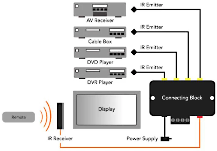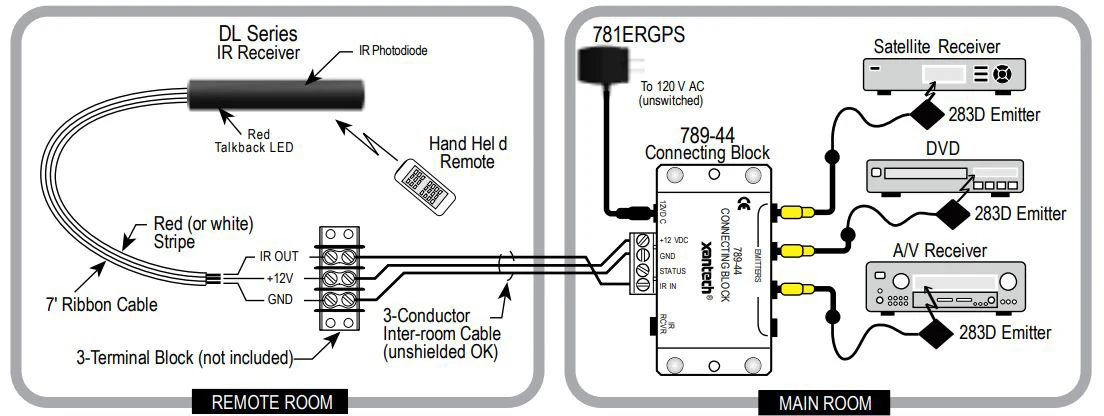 - One Model 789-44 connecting block that connects one IR receiver to 4 IR emitter ports and has enough power to drive up to 4 dual emitters