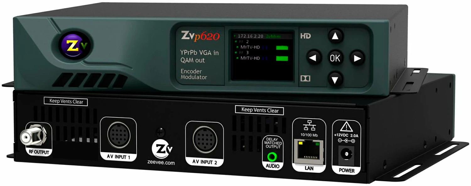 Based on the same technology used by TV stations and cable companies, ZvPro 620 makes it affordable to convert your VGA or Component video into an HDTV channel and broadcast it over simple to use COAX wiring to everyon-premise. Its standard QAM cable channel output can be receivedby practically any off-the-shelf digital cable-ready HDTV without requiring an additional box at the TV.