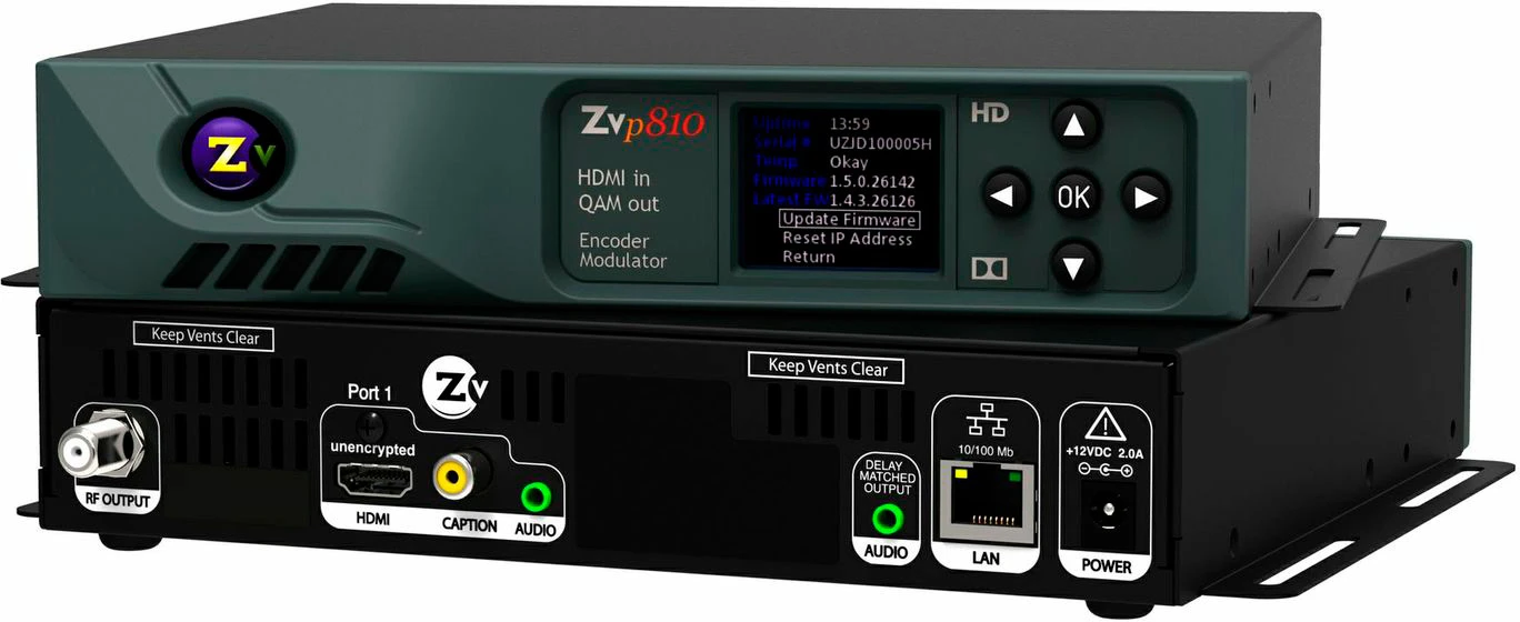 ZeeVee ZvPro800 series delivers uncompromising digital HD video distribution over existing coax cabling from unencrypted HDMI sources. This MPEG2, Encoder/Modulator unit allows you to easily distribute content up to 1080p resolution to an unlimited number of displays, using the TV’s built-in tuner, eliminating the need for set-top-boxes or media players at each display. Manage ZvPro units can locally through the color LCD screen or via an intuitive web-based, management interface – Maestro. Generate a looping signage channel with ZvShow, deliver messages to any screening using the built-in Emergency Alert System. The ZvPro supports Dolby Digital audio encoding and the included Closed Captioning makes your installation ADA compliant. ZvPro allows you to control power output from 25 to 45dBmV QAM output levels in 1dBmV steps. ZvPro delivers resolutions from 480i to 1080i/p, which means you’re covered regardless of content resolution.